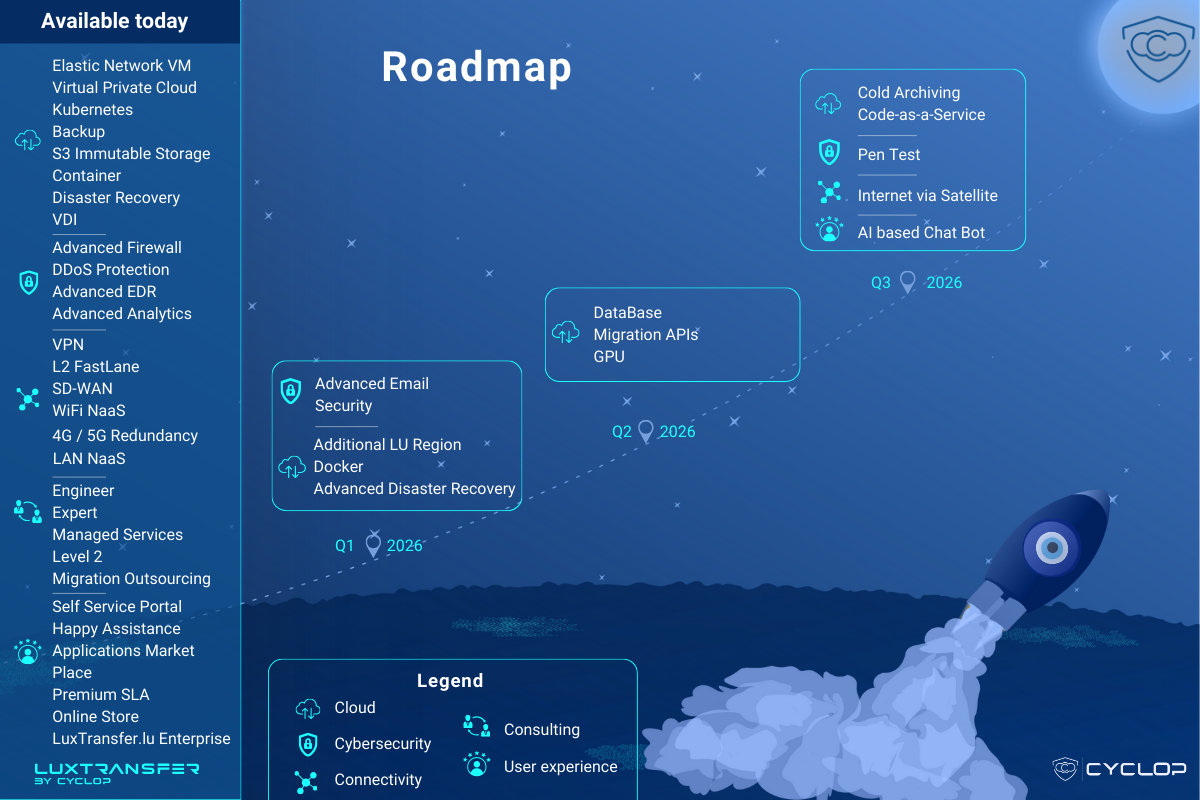 Cyclop propose le meilleur du cloud : la souveraineté 100% au Luxembourg alliée à l’innovation et l’automatisation. Notre Cloud sécurisé est simple d'utilisation, en modèle pay-as-you-wish, et vous permet de libérer les budgets pour des sujets tels que la cybersécurité, cruciale pour grandes entreprises et indépendants. La proximité de notre équipe vous permet de bénéficier d’un accompagnement local et sur mesure.